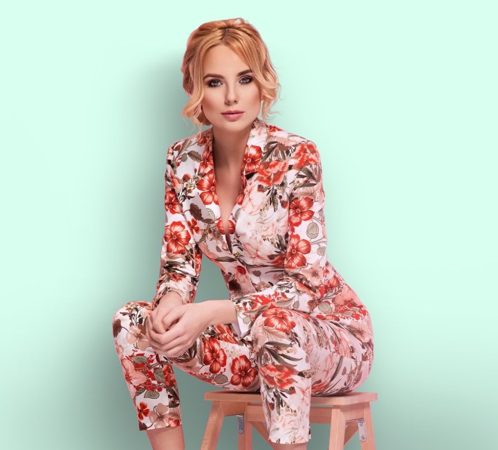 Kadın uzun kollu önden fermuarlı leopar desenli viskon iki iplik bluz ve pantolon ikili takım